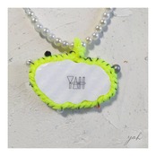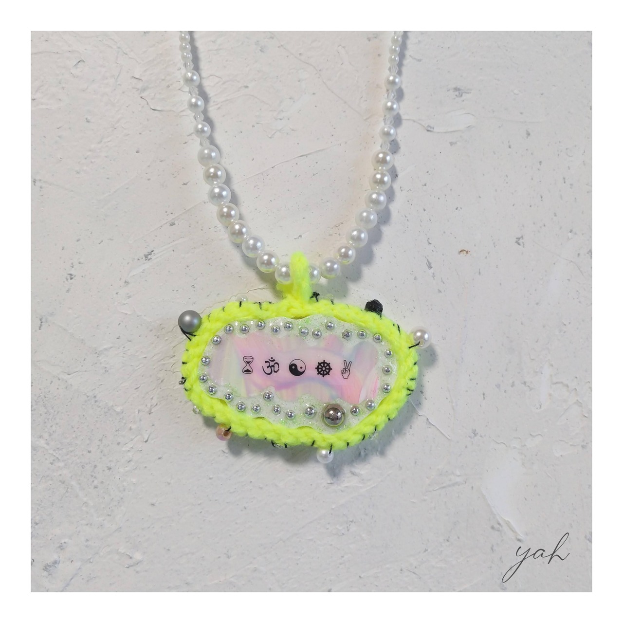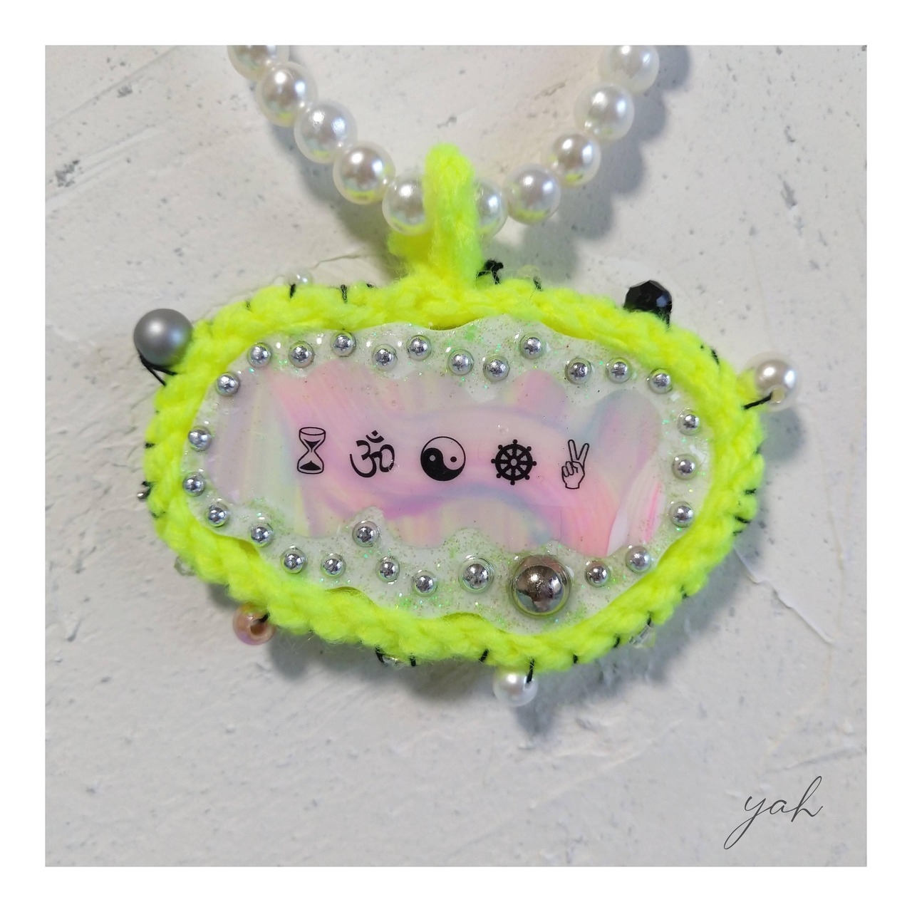 ネオンイエローの毛糸の囲まれた不思議な形と謎のメッセージのペンダントトップ。