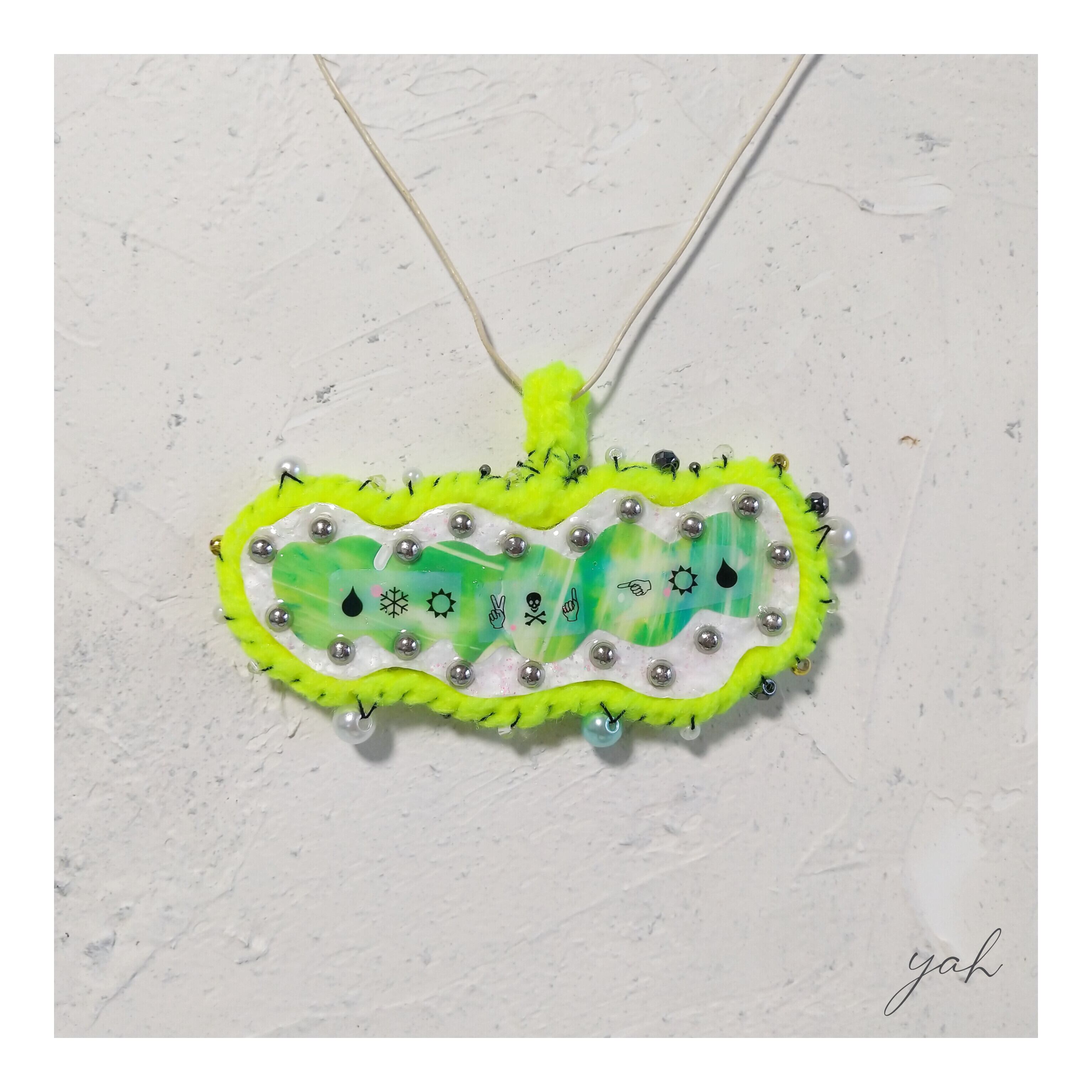ネオンイエローの毛糸の囲まれた不思議な形と謎のメッセージのペンダントトップ。
